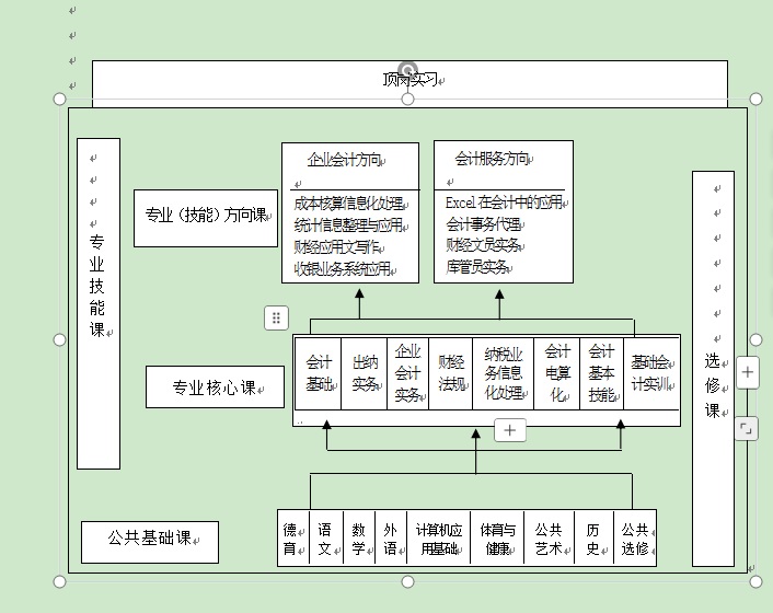 专业技能课包括8门专业核心课、2个专业(技能)方向课和技能实训课。专业核心课对接中小企业出纳岗位和基本会计核算岗位能力要求,满足会计从业资格需要,是本专业学生必须具备的专业基本知识、基本方法和基本技能;专业(技能)方向课采取模块式构架,满足学生不同行业会计核算能力要求或服务学生就业拓展需要。各专业(技能)方向课的学时数应大体相当,学生至少要选择一个专业(技能)方向的课程学习。技能实训课包括专业基本技能实训课程、专业综合实训课程和顶岗实习课程。